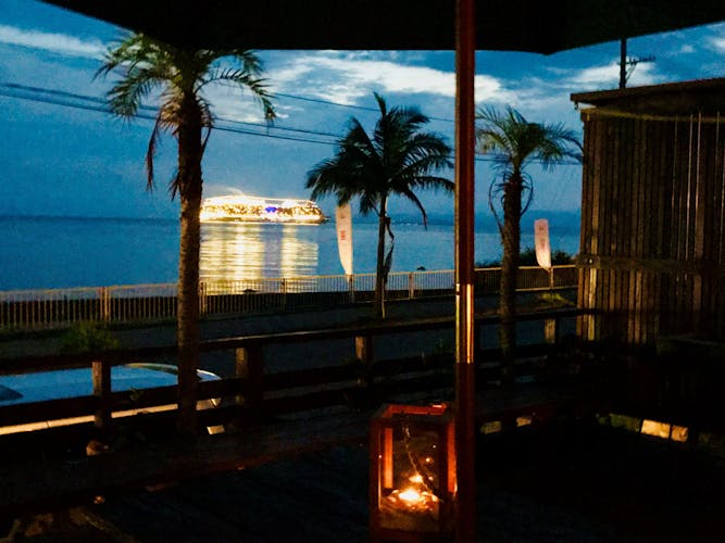 テラスから眺めば、夕日と離島の島々が水平線を、ぼーっと眺められる。