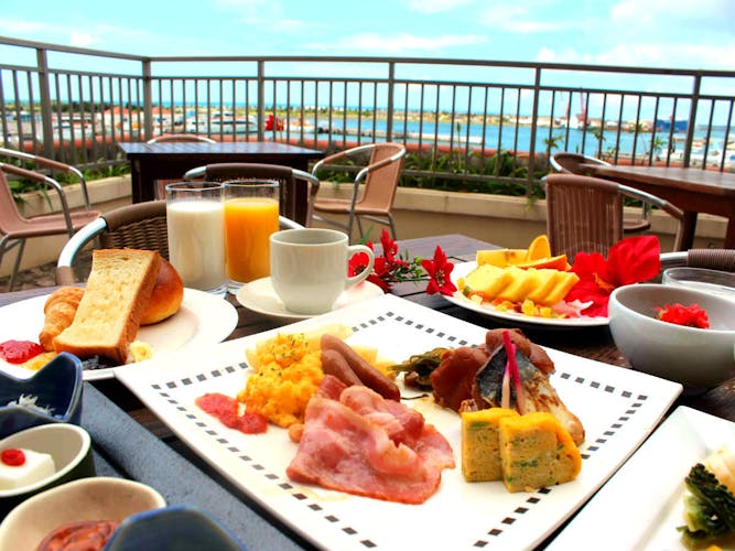 ホテルイーストチャイナシーは、オリジナルの宿泊プランが用意されており、沖縄でおなじみの『ブルーシールアイス』と手作り島料理セットが選べます。